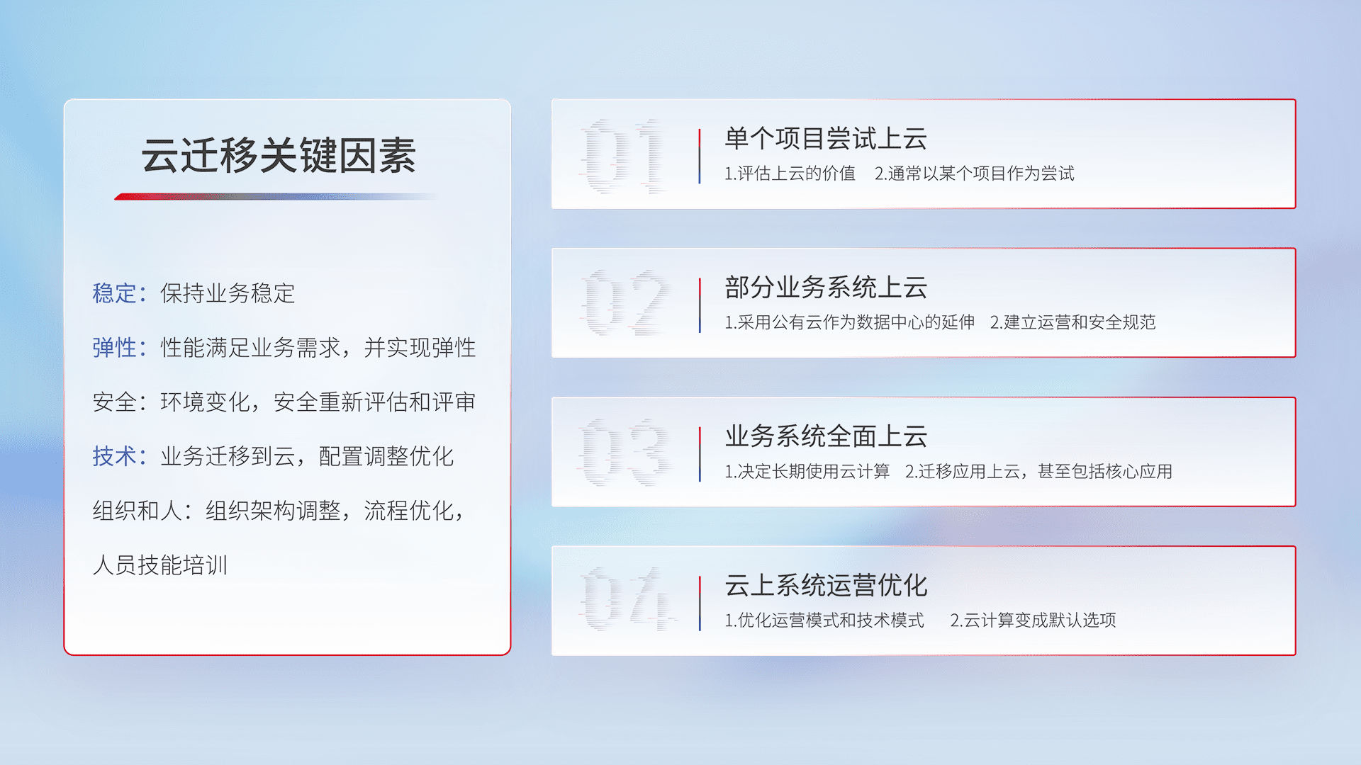 结合实际业务,,从规划设计、、、、云平台选型、、云原生改造、、、数据迁移、、、、集成交付,,迁移全过程为客户识别最佳上云路径,,,,做好风险识别管理,,设计网络架构、、、、身份权限、、、安全审计合规、、、、操作审计、、日志审计、、监控告警策略、、多站点容灾设计等,,,,对云上基础设施进行整体规划,,,,提升IT治理水平,,以满足弹性、、、高可用、、、、高性能的需求。。。