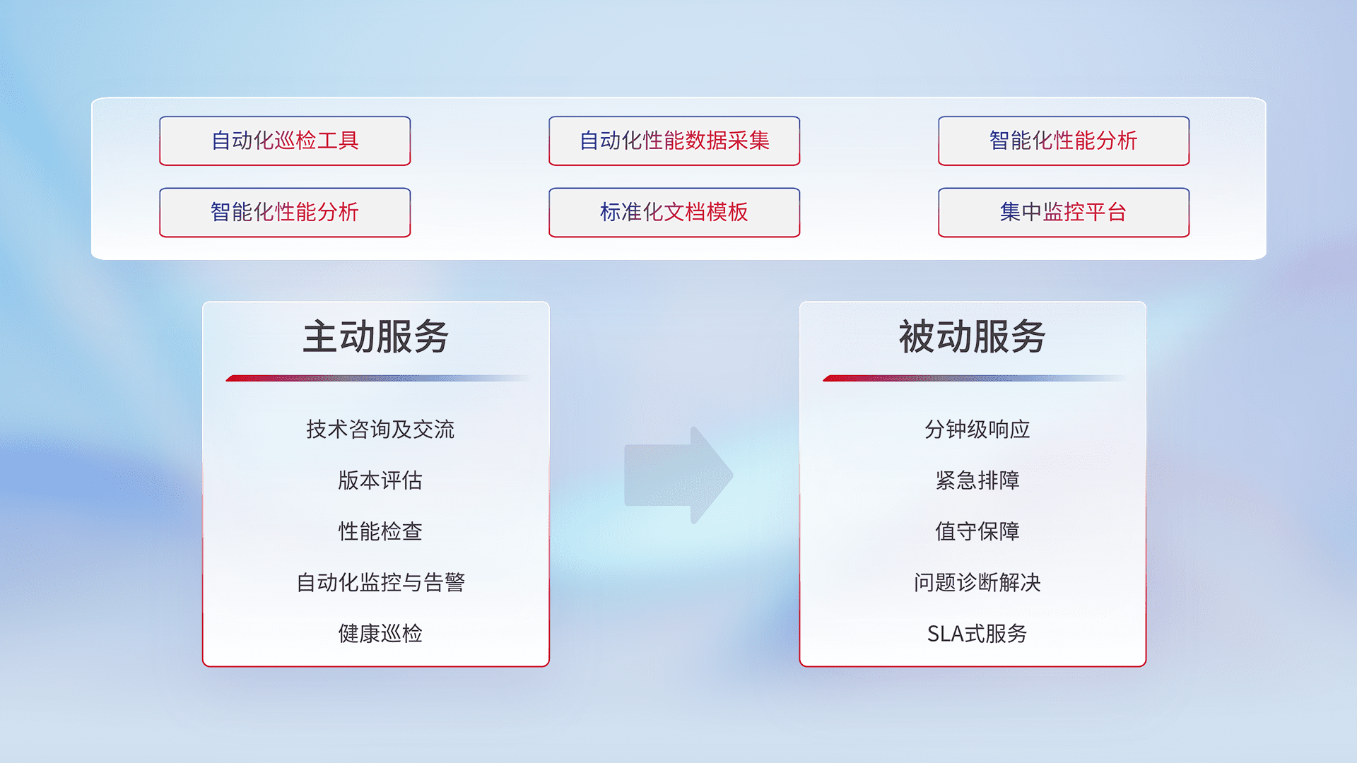智能化工具和标准化文档,,保障服务质量,,提供主动服务(包含技术咨询、、、版本评估、、、、性能检查、、、、自动化监控与告警、、、、健康巡检)和被动服务包含(分钟级响应、、、、紧急排障、、、、值守保障、、问题诊断解决、、、SLA服务)。。。